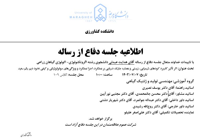 جلسه دفاع از رساله دکتری، گروه مهندسی تولید (زمان دفاع:شنبه 7 مهر 1403) - دانشکده مهندسی کشاورزی دانشگاه مراغه