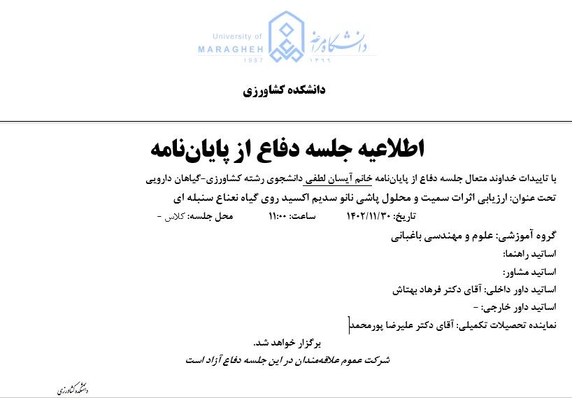 جلسه دفاع از پایان نامه، گروه مهندسی باغبانی (زمان دفاع: دوشنبه 30 بهمن 1402) - دانشکده مهندسی کشاورزی دانشگاه مراغه