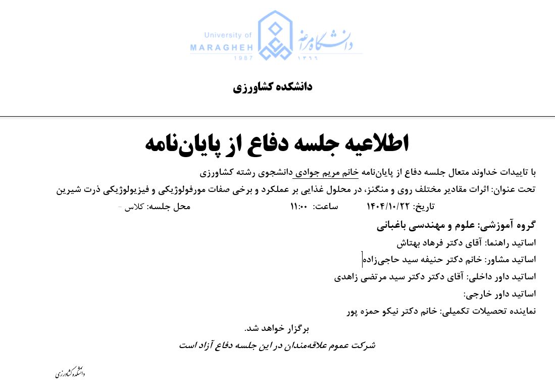جلسه دفاع از پایان نامه، گروه مهندسی باغبانی (زمان دفاع: دوشنبه، 22 دی 1404) - دانشکده مهندسی کشاورزی دانشگاه مراغه