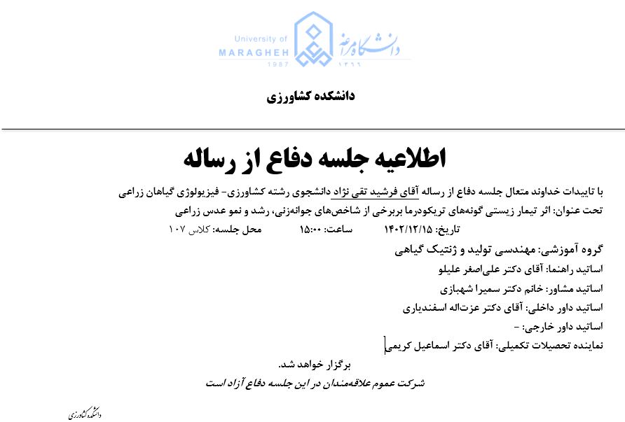 جلسه دفاع از پایان نامه کارشناسی ارشد، گروه مهندسی تولید (زمان دفاع:سه شنبه، 15اسفند 1402) - دانشکده مهندسی کشاورزی دانشگاه مراغه