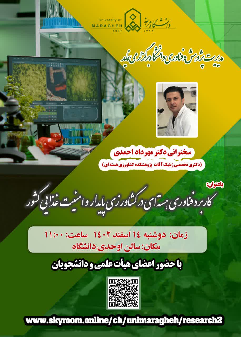سخنرانی دکتر مهرداد احمدی باعنوان: کاربرد فناوری هسته ای در کشاورزی پایدار و امنیت غذایی کشور - دانشکده مهندسی کشاورزی دانشگاه مراغه